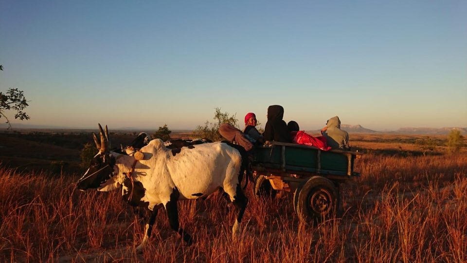 A gauche : départ à l’aube pour rejoindre en charrette le village de Tsivoko, avec le massif du Makay en arrière-plan