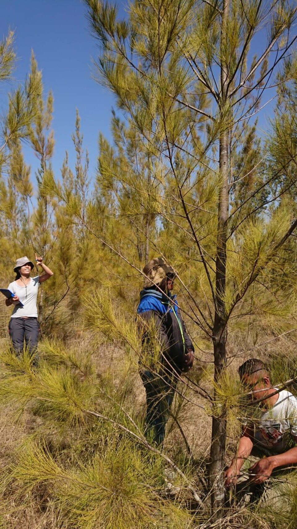 A gauche : mesure de la hauteur et du diamètre d’un échantillon d’arbres à Ibity