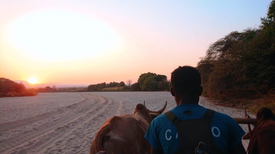 A gauche : les déplacements entre villages se font, comme de coutume, en charrette à zébu